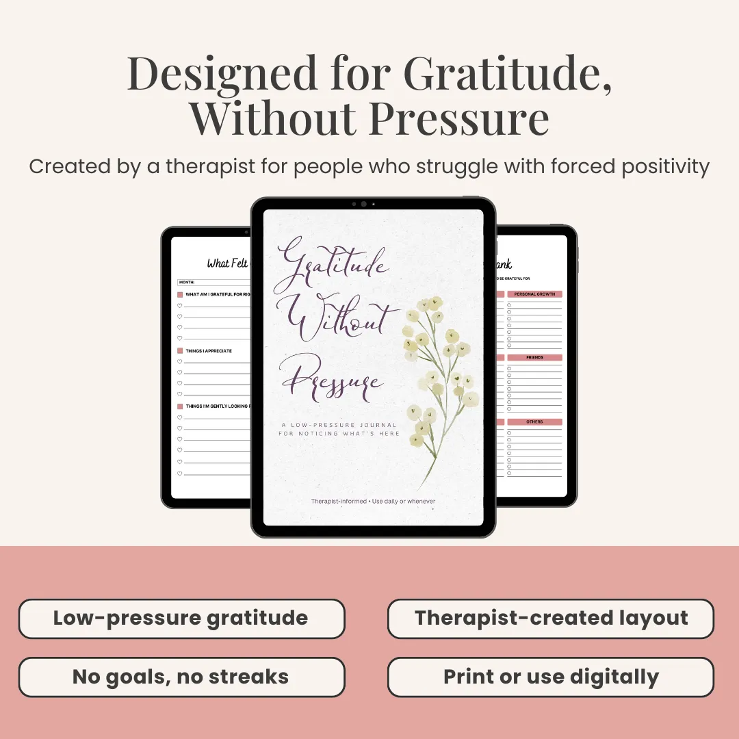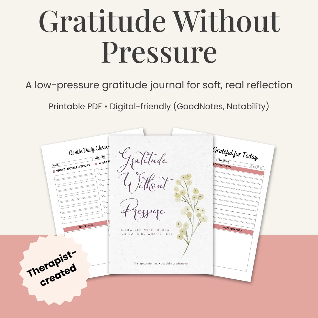 Gratitude does not have to be forced, positive, or productive to be meaningful. Gratitude Without Pressure is a therapist-informed gratitude journal designed for gentle emotional check-ins, not fixing, reframing, or finding a silver lining. This printable and digital-friendly journal helps you notice what is here at your own pace, without pressure to feel grateful in the “right” way.